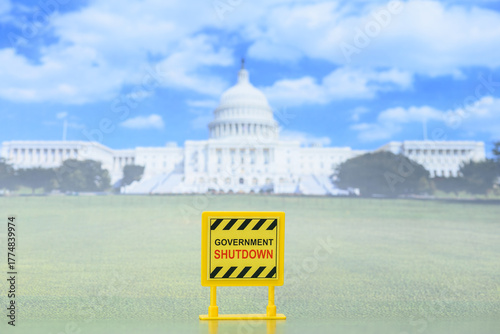 Fototapeta premium Close-up of yellow “Government Shutdown” sign in front of the U.S. Capitol building. Visual metaphor for budget freeze, federal services halt, political deadlock and economic danger.