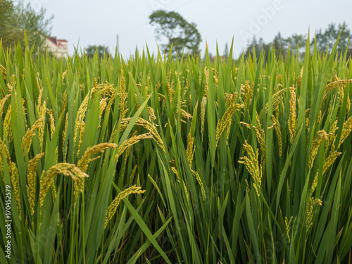 Obraz premium close up of yellow green rice field