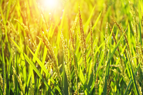 © Phatthaya, Fototapeta premium Close-up of yellow paddy rice field waiting for harvest in Thailand