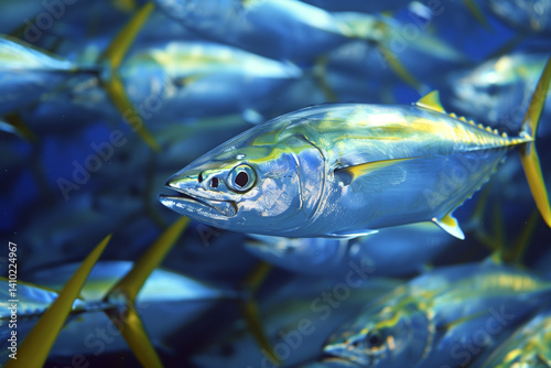 Fototapeta premium Close-up of yellowfin tuna swimming in school underwater in blue ocean environment