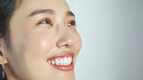 Obraz premium Close-Up of Young Asian Woman's Radiant Smile, Emphasizing Perfect White Teeth on Clean White Background