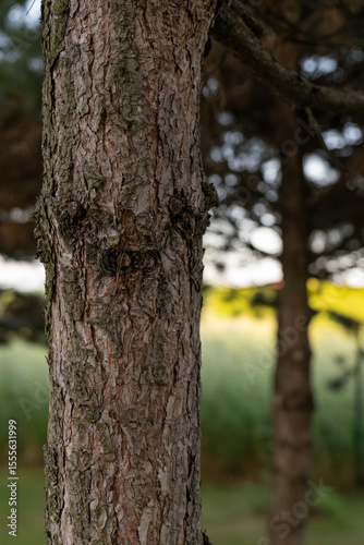 © lapis2380, Fototapeta premium Close-up of young pine bark on the trunk, showing smooth texture and subtle color variations in natural light.