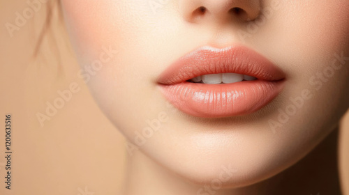 Fototapeta premium close up of young woman lips showcasing natural, soft look with subtle shine. image highlights beauty and detail of lips against neutral background