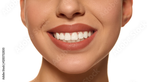 © Lustre Art Group , Obraz premium Close-up of young woman’s bright smile with white, healthy teeth and natural lip color against white studio background. Concept of natural beauty, cosmetology products, self-care, wellness.