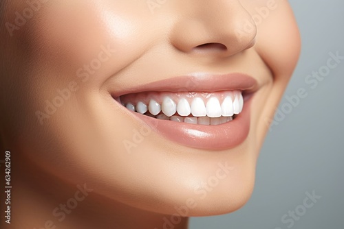 Fototapeta premium Close up of young woman smiling with perfect white teeth. Generative AI
