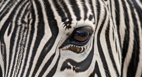 Obraz premium Close-up of zebra eye and stripes pattern in black and white