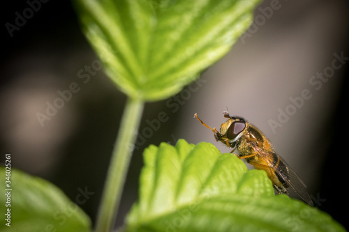 © Melanie, Naklejka premium Close up on a fly or a bee resting on a green leaf with pollen bag on its leg