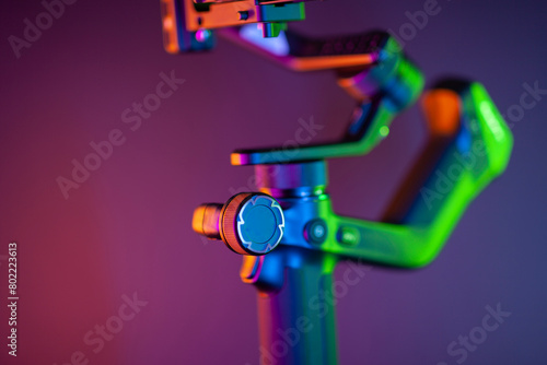 Fototapeta premium Close up on a modern gimbal for videomaking, background is black.