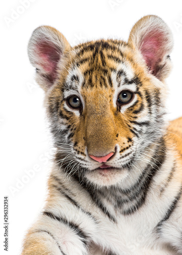 Fototapeta premium Close-up on a Two months old tiger cub against white background