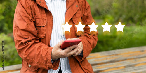 © Shi , Fototapeta premium Close up on customer woman hand pressing on smartphone screen with gold five star rating feedback icon for service business concept.