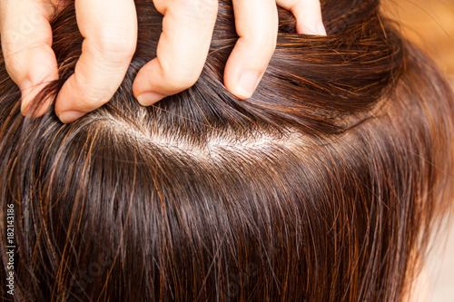 © ThamKC, Fototapeta premium Close-up on dyed hair roots of woman. No more grays.