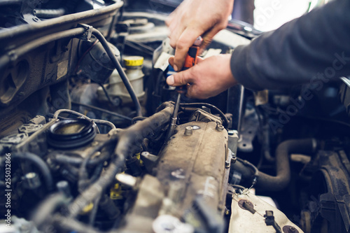 © Miljan Živković, Obraz premium Close Up on Mechanics hands repairing opening car engine at the workshop garage