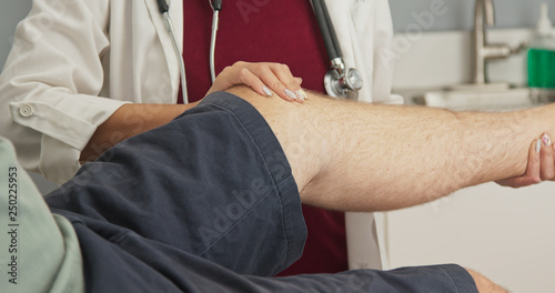 Fototapeta premium Close up on physical therapist manipulating knee of patient testing range of...