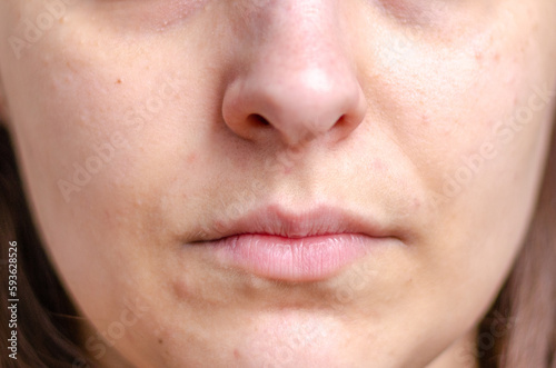 Obraz premium close up on white female face with some acne and dark circles, no make up