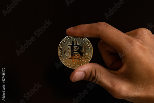 Fototapeta premium Close up one golden coin with the bitcoin symbol in hand. Young hand holding cryptocurrency coin, Money coins digital, BTC
