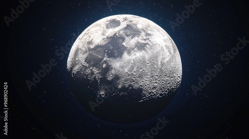 © P.G, Fototapeta premium Close-up panoramic image of the moon in a crescent phase, with the rough surface illuminated by cosmic light. No people. No logo.