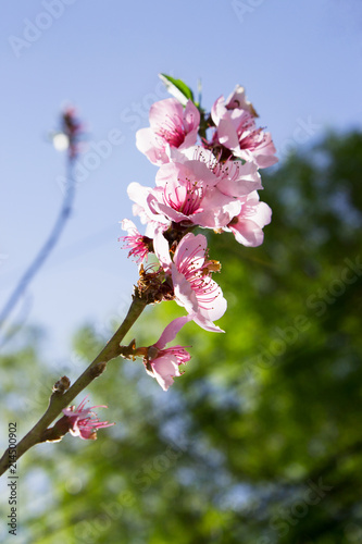 Obraz premium Close up peach tree branch with flower blossoms, natural background and sky view