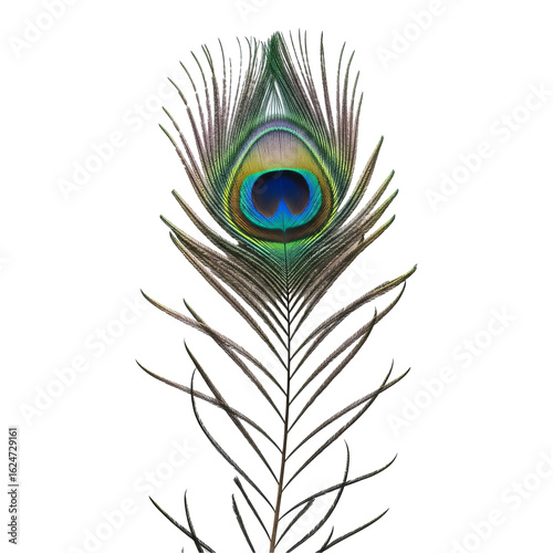 © Musrat Perveen, Fototapeta premium Close up peacock feather eye pattern iridescent colors vibrant detail exotic bird plumage isolated black background on transparent background