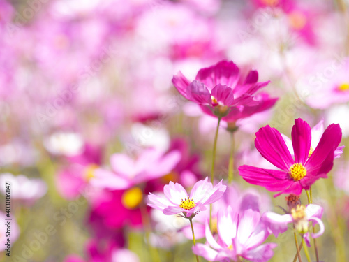 © pkanchana, Obraz premium Close up petal pink cosmos blooming over clear blue sky.