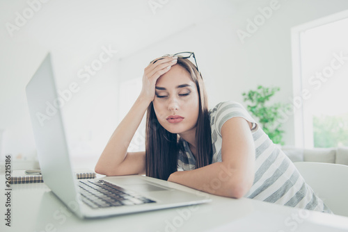 © deagreez, Obraz premium Close up photo beautiful she her lady notebook table sleepy eyes closed head lean arm hand sleepless night wait skype call wear jeans denim striped t-shirt sit comfort chair house living room indoors