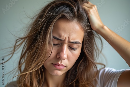 Obraz premium Close-Up Photo Capturing Hair Movement and Dandruff Flakes as Person Scratches Head