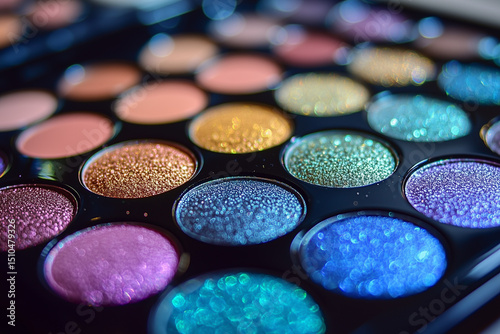 Naklejka premium Close-up photo of a big eyeshadow, glittery shimmer colorful eyeshadows,...