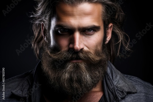 © Hanna Haradzetska, Fototapeta premium Close-up photo of a dense, styled beard and mustache on a black matte background