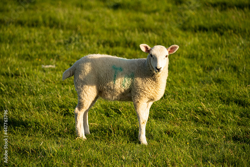 Fototapeta premium Close-up photo of a sheep standing and eating from the grass