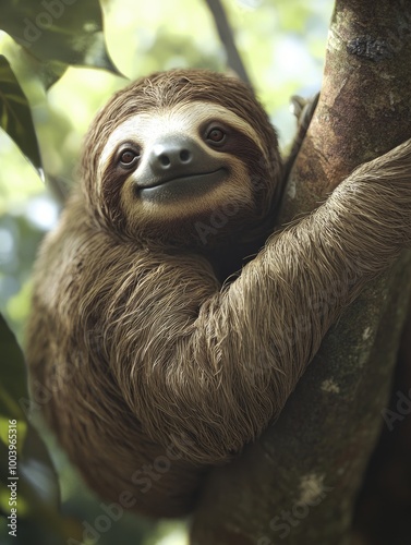 © vefimov, Fototapeta premium Close-up photo of a slow loris with a friendly smile, perched on a tree branch.