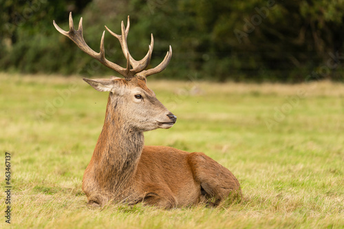 © Enrique, Fototapeta premium Close-up photo of a young red deer sitting in the grassland during the rutting season in autumn.