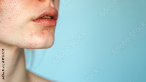 © Hanna Haradzetska, Obraz premium Close-up photo of a young woman's jawline with post-acne marks on a pale blue background
