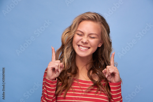 © Антон Пухов, Fototapeta premium Close up photo of an attractive excited girl with straight index fingers eyes closed and tongue showing empty space show novelty banner dressed in red clothes with yellow stripes on a blue background