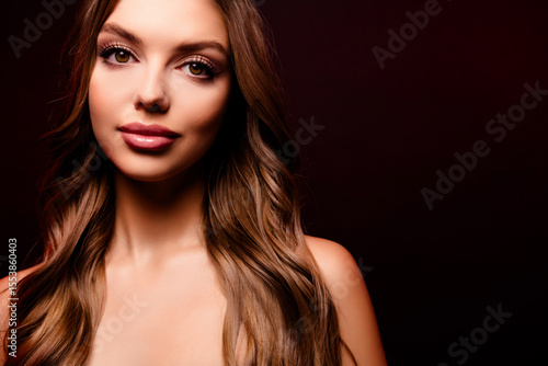© Beauty Hero, Fototapeta premium Close up photo of attractive lovely girl model looking camera promoting cosmetics isolated black color background