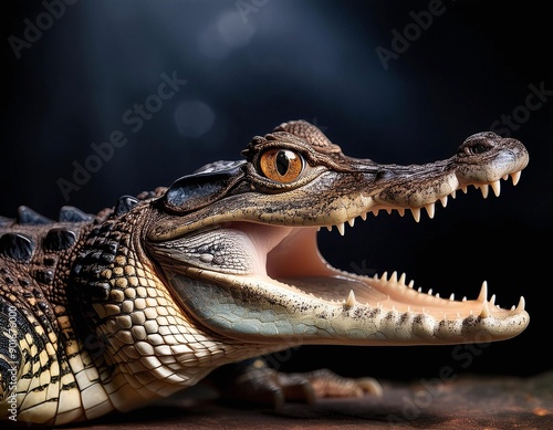 Fototapeta premium Close-Up Photo of Baby Crocodile with Mouth Open, Focusing on Large Prominent...