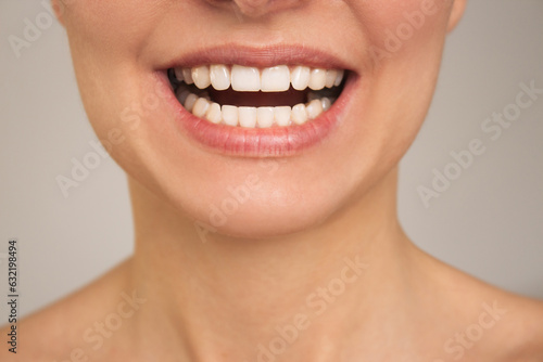 Obraz premium close-up photo of beautiful natural smooth white female teeth. Dentistry and...