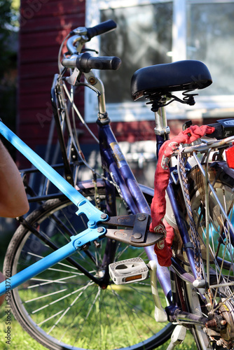 Obraz premium Close up photo of bicycle being stolen. Man Breaks a bike chain with pliers....