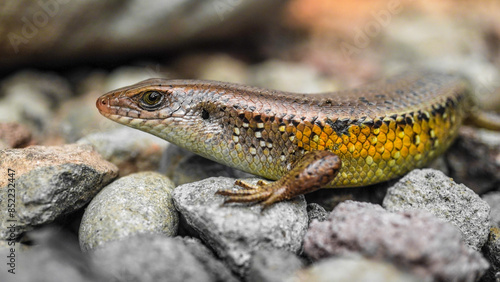 © Rizky, Naklejka premium Close up photo of Brown indian sun skink sunbathing on a rock. Common garden lizard laid on the rocky ground. Concept for World Animal Day.