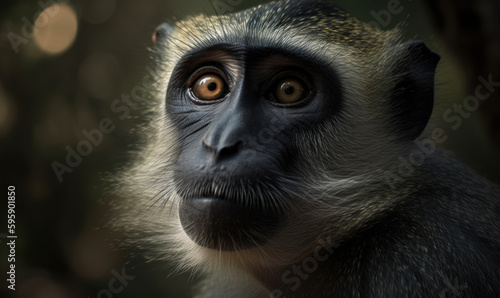 © Bartek, Obraz premium close up photo of DeBrazza’s monkey on blurry jungle background. Generative AI