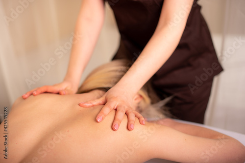 © Arina, Fototapeta premium Close up photo of deep tissue massage. Masseuse doing shoulder and back massage. Client lying and relaxing