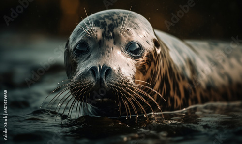 Fototapeta premium close up photo of harbour seal with blurry natural background. Generative AI