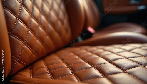 Obraz premium Close up photo of luxury car interior. Brown leather with diamond pattern stitching. Automotive design with detailed texture. Elegant car upholstery for comfortable ride.