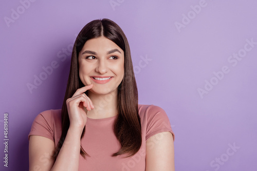 © Tetiana, Fototapeta premium Close up photo of nice attractive girl happy positive smile finger touch chin look empty space isolated over violet color background