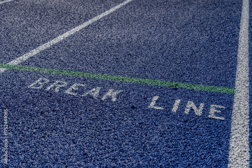 Obraz premium Close up photo of outdoor blue running track with white lane lines, with the word, break line, on a new track.