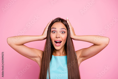 © deagreez, Fototapeta premium Close up photo of pretty attractive lady showing emotions model touching head hearing about discounts news astonished wearing bright outfit isolated on rose-colored background
