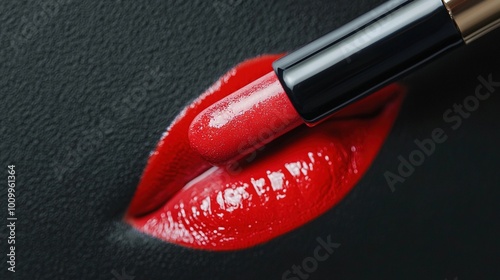 Obraz premium Close-up photo of red lipstick on black background with gold lip ring on...