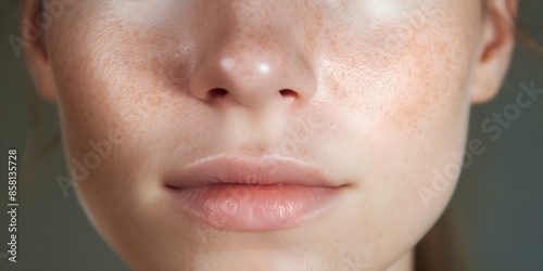Obraz premium Close-Up Photo of Woman's Face Showing Melasma Skin Condition Caused by Sun Exposure. Concept Skin Health, Sun Damage, Melasma Treatment, Close-Up Photography, Skin Conditions