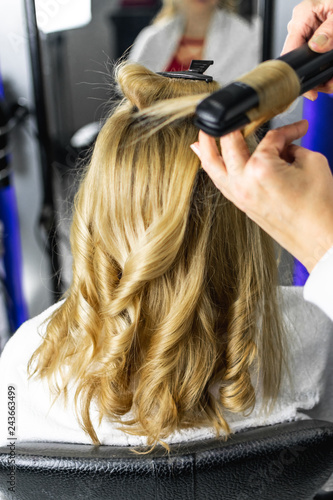 © stivog, Fototapeta premium Close-up photo professional hairdresser uses flat iron for making curls on beautiful blonde hair. Client sitting on the chair