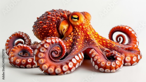 © Chananphat, Obraz premium Close-Up Photograph of a Red Octopus with Visible Eyes and Eight Spread-Out Tentacles Against a White Background, Centered and Clear with Sharp Focus