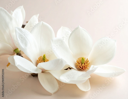 © mynad, Obraz premium close-up photograph showcases the pristine white petals and vibrant yellow and green center of a blooming magnolia flower. Another slightly blurred magnolia blossom lies in the soft focus background,