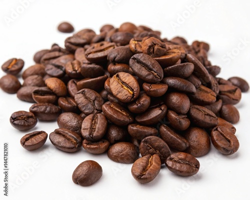 © Background, Naklejka premium close-up pile of brown coffee beans on white backdrop showing texture and freshness